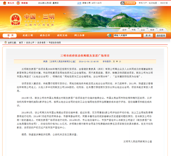现总会转载三明市人民政府官网《三明市人民政府依法收购联友家居广场项目》全文,以示依法、公平、公正处理有关事宜。